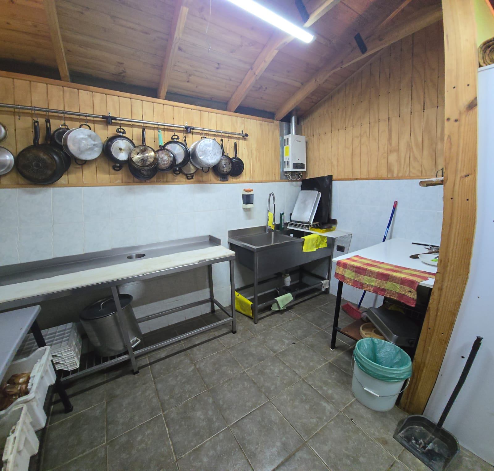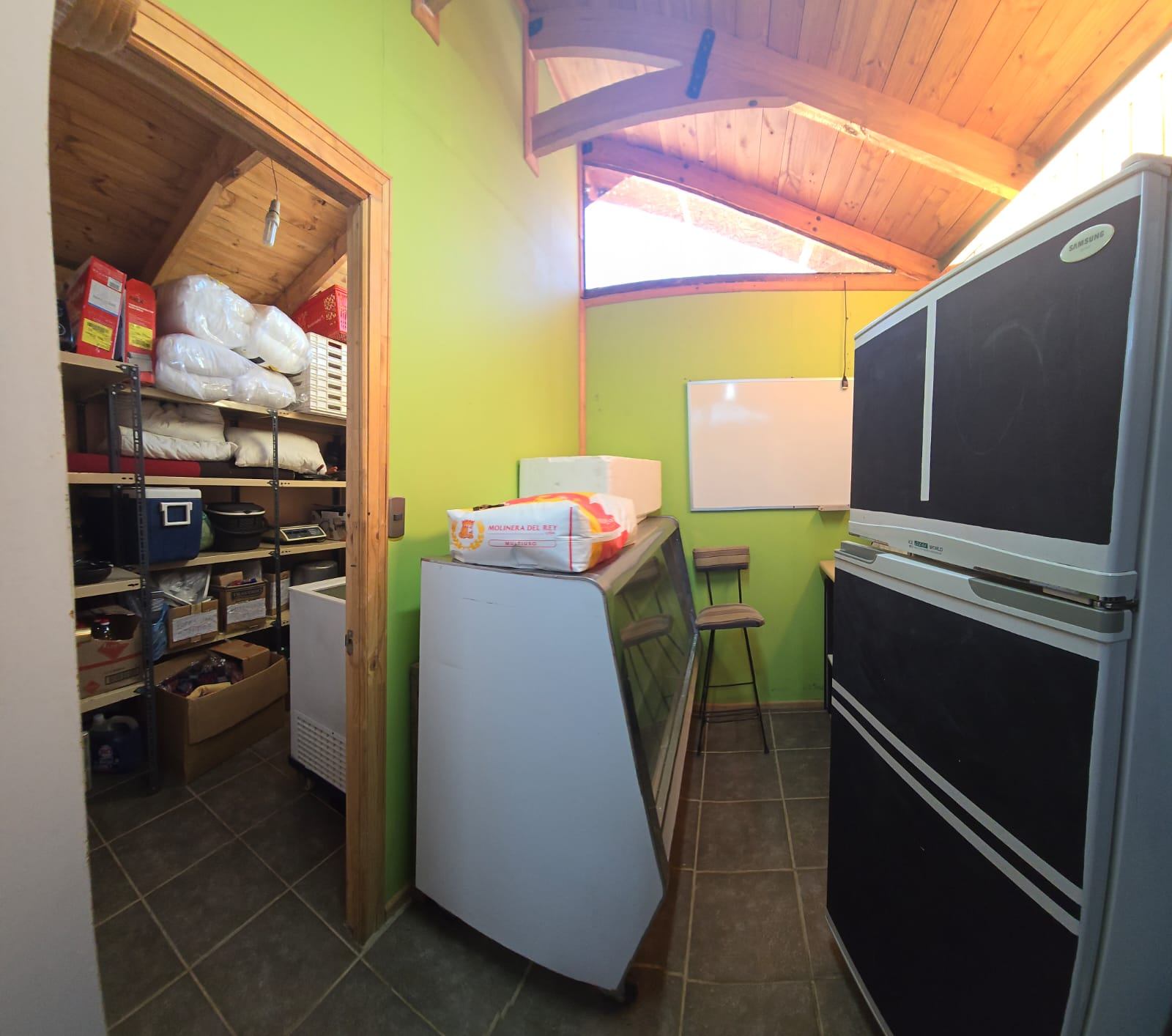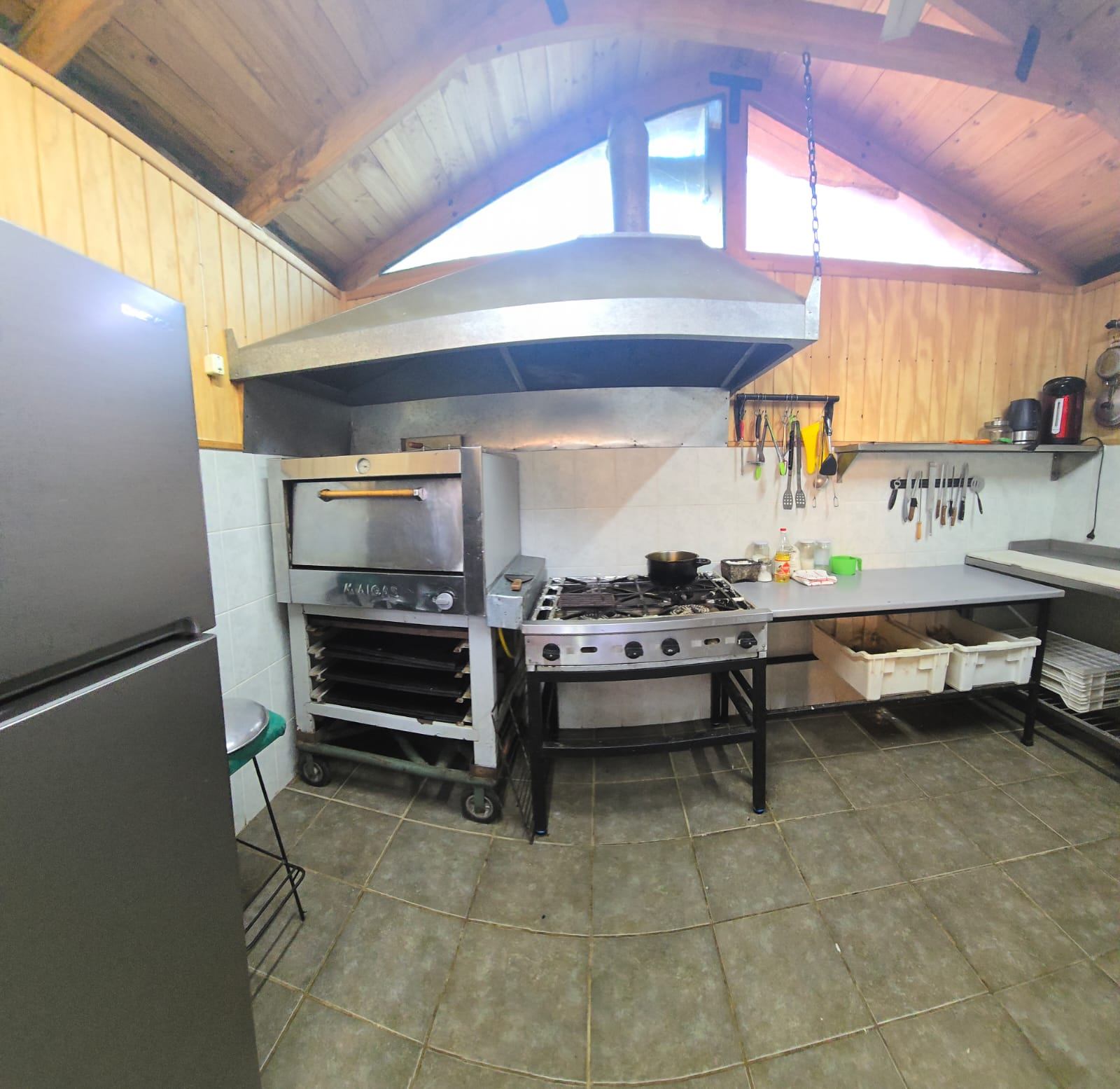 Zona de Cocina equipada con horno y cocina industrial, mesones en acero inoxidable, refrigeradores, freezer, bodega con estanterías metálicas, bueno espacios para trabajar.