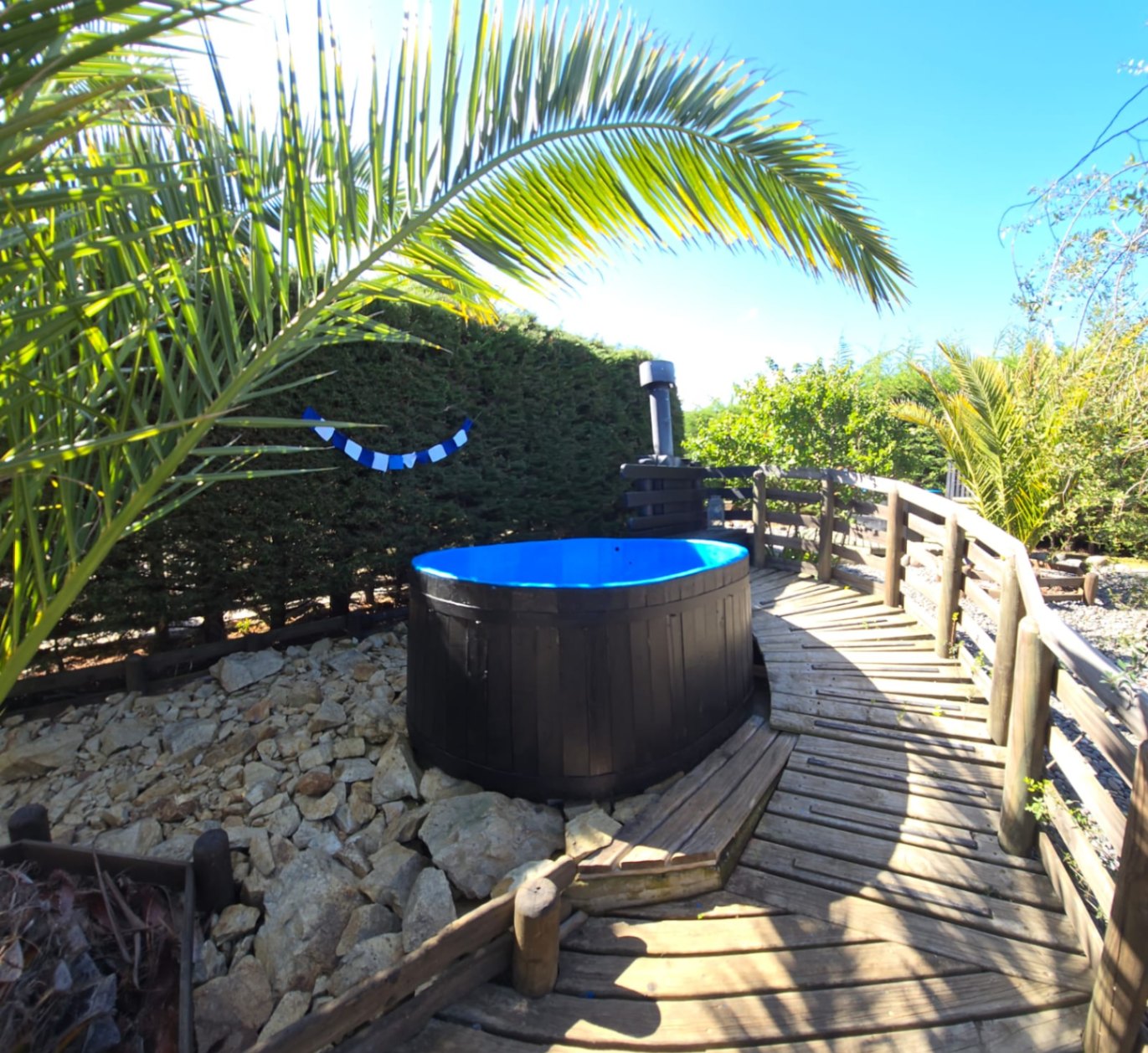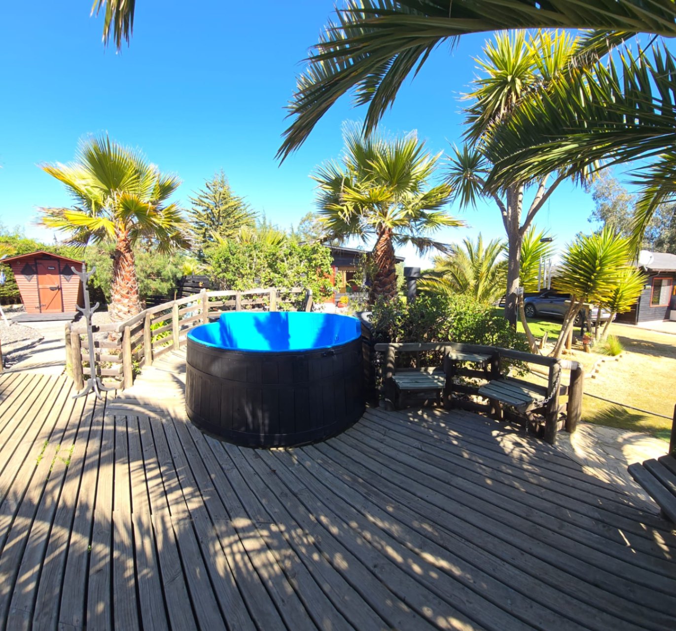 Sector SPA y Piscinas: Piscina grande y piscina niños, decks en madera con toldos para sombra y reposeras. Baños para piscina y Spa, Sauna, 3 Tinajas de agua caliente revestidas en fibra de vidrio, con sistema de filtro que se alimentan a gas a través de calefont para mayor comodidad y seguridad para los usuarios.