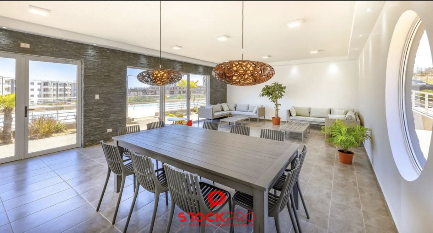 El condominio ofrece una serie de características de alta calidad, incluyendo acceso controlado, gimnasio, piscina, jacuzzi, y un salón de usos múltiples. Además, cuenta con estacionamiento cubierto para dos vehículos, acceso a internet, agua corriente, y calefacción, garantizando un estilo de vida cómodo y moderno. Las áreas verdes y de juegos infantiles brindan un ambiente ideal para familias, mientras que las terrazas y el jardín son perfectos para disfrutar de momentos al aire libre.